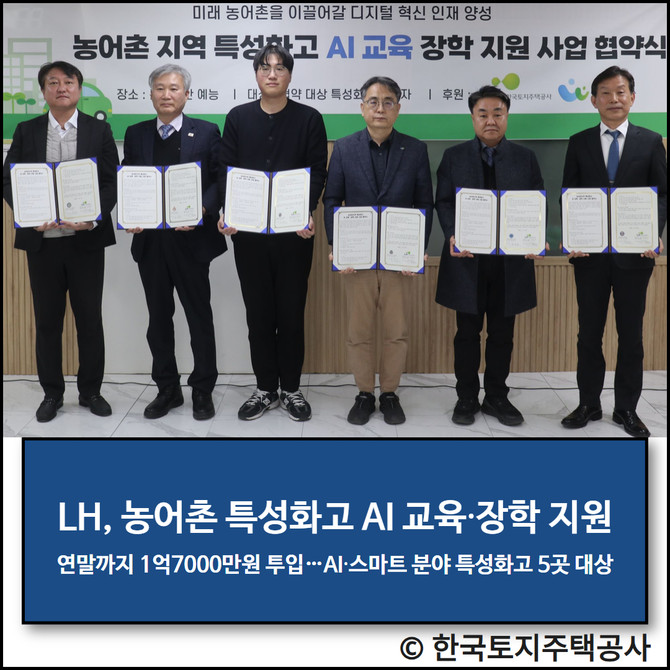 한국토지주택공사(LH)는 농어촌 상생협력기금을 활용해 '농어촌 특성화고 인공지능(AI) 교육·장학 사업'을 추진한다고 29일 밝혔다.