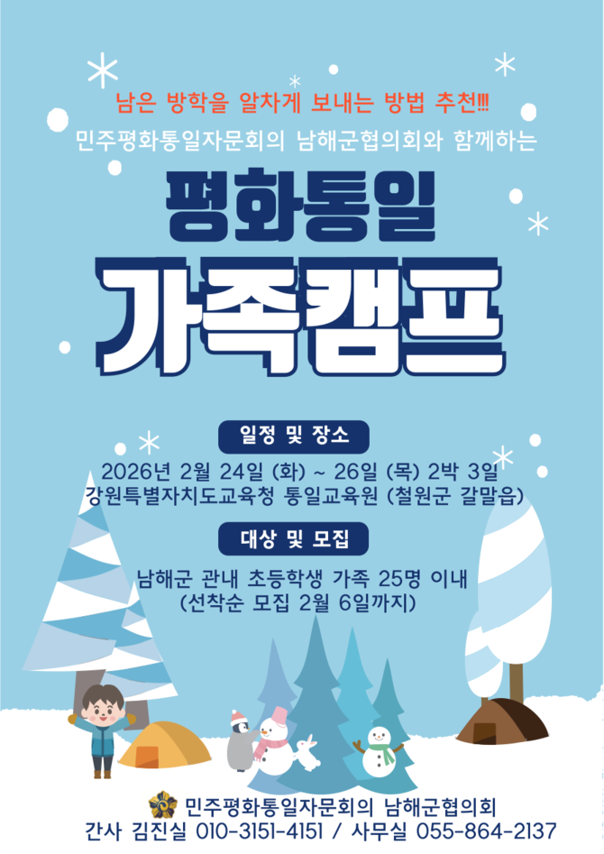 민주평화통일자문회의 경남남해군협의회(회장 류영환)는 관내 초등학생과 그 가족을 대상으로 '2026 평화통일 가족캠프' 참가자를 모집한다고 29일 밝혔다.
