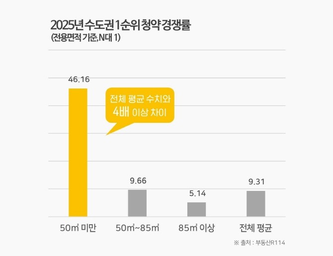 부동산R114 자료를 보면, 지난해 수도권 초소형 아파트는 1순위 청약 결과 △모집 755가구(특별공급 제외) △접수 3만4852건으로, 평균 경쟁률 46.16대 1을 기록했다. 이는 수도권 1순위 평균 경쟁률(9.31대 1) 4배를 상회하는 수치다.