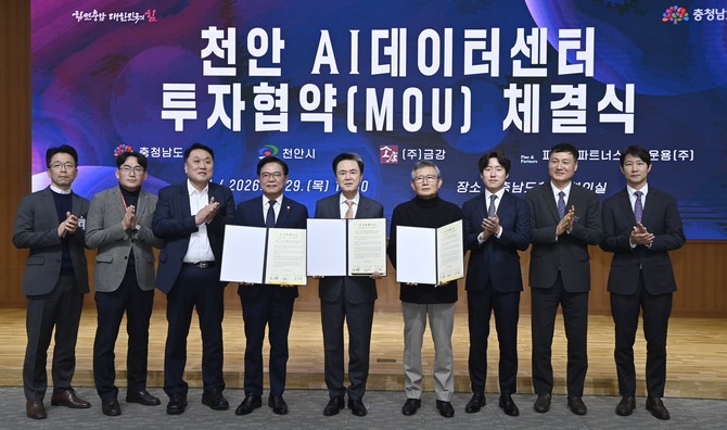 충남도는 29일 도청 대회의실에서 김태흠 충남지사, 김용성 ㈜금강 회장, 김석필 천안시장 권한대행이 참석한 가운데 1조2000억원 규모의 AI 데이터센터 투자협약(MOU)을 체결했다고 밝혔다. 이번 협약은 충남도의 올해 첫 대규모 투자 유치 성과로, AI·데이터 산업을 미래 성장축으로 삼겠다는 도의 전략이 본격화됐다는 평가다.