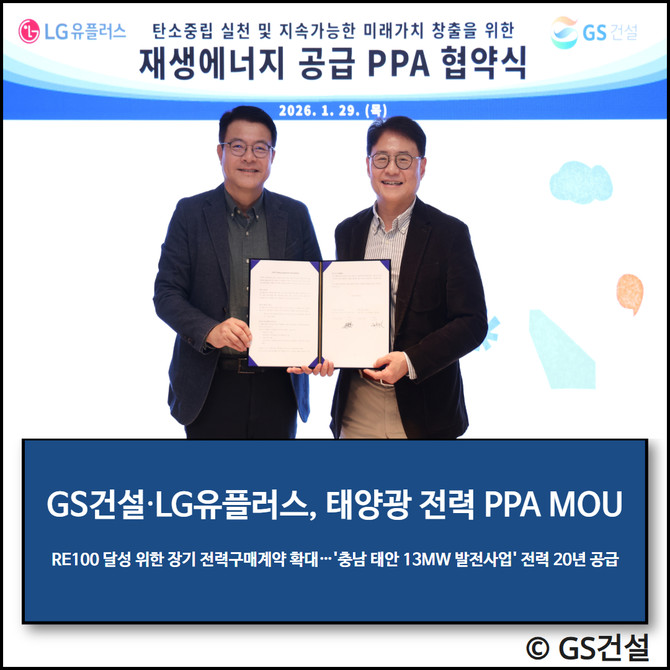 GS건설(006360)은 LG유플러스(032640)와 태양광 발전을 통해 생산된 전기를 직접 사고파는 전력구매계약(PPA) 공급 확대를 위한 업무협약을 체결했다고 30일 밝혔다.