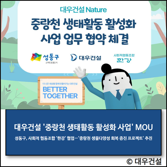 대우건설은 임직원 봉사활동을 통해 중랑천에 '대우건설 네이처' 공간을 조성하고 하천 정화와 식생 복원 등 생태 활동을 추진할 계획이다. 성동구는 행정 지원을, 사회적협동조합 한강은 생태 조성과 모니터링, 자원봉사자 교육을 담당한다.