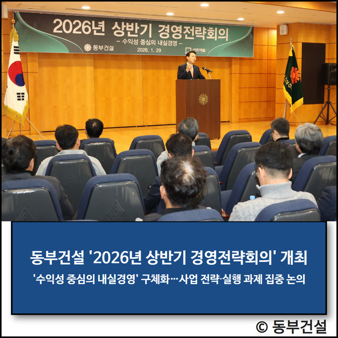 동부건설(005960)은 지난 29일 서울 강남구 역삼동 본사에서 '2026년 상반기 경영전략회의'를 열고, 올해 경영방침으로 설정한 '수익성 중심 내실 경영'을 실행 전략으로 구체화하기 위한 논의를 진행했다고 30일 밝혔다.