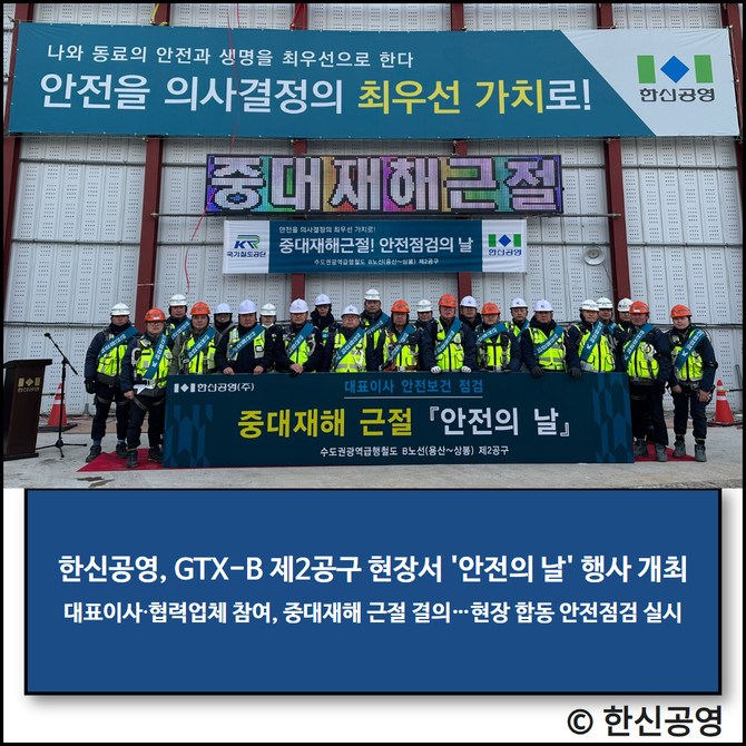 이번 행사는 GTX-B 제2공구 건설 현장에서 열렸다. 이 자리에는 전재식 대표이사를 비롯한 본사 임직원과 현장 직원, 협력업체 근로자들이 참석했다. 행사는 중대재해 근절 결의문 선서를 시작으로 △안전보건 LED 간판 점등식 △무재해 기원 서명 및 케이크 컷팅 △합동 현장 안전 점검 순으로 진행됐다.