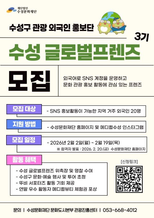 대구 수성문화재단(이사장 김대권)은 오는 3월부터 12월까지 수성구의 문화 관광지와 수성구 대표 캐릭터 '뚜비'를 사회관계망서비스(SNS)를 통해 홍보할 외국인 홍보단 '수성 글로벌프렌즈 3기'를 모집한다.