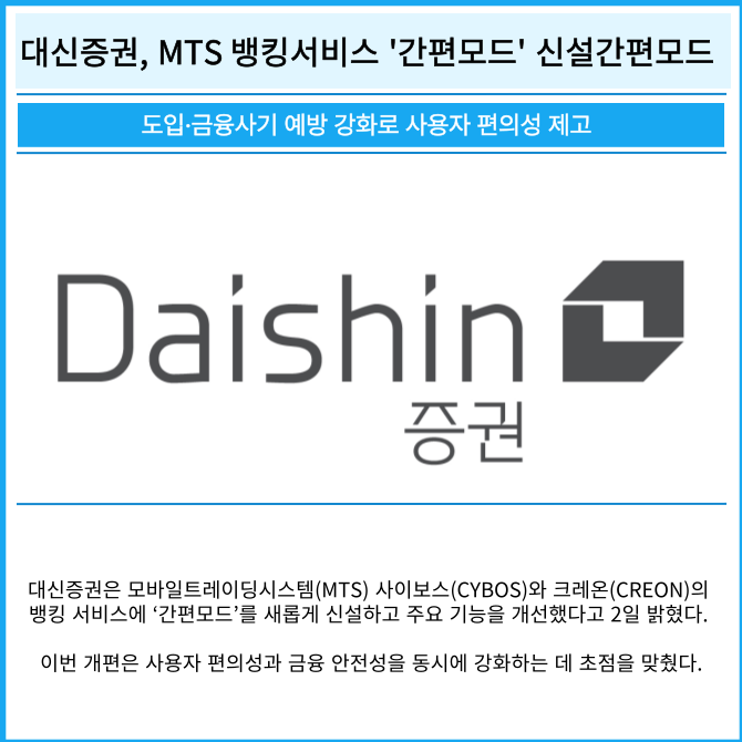 [프라임경제] 대신증권(003540)은 모바일트레이딩시스템(MTS) 사이보스(CYBOS)와 크레온(CREON)의 뱅킹 서비스에 ‘간편모드’를 새롭게 신설하고 주요 기능을 개선했다고 2일 밝혔다.