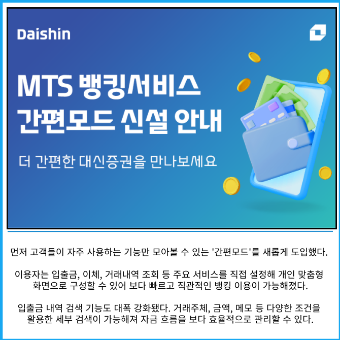 [카드] 대신증권, MTS 뱅킹서비스 '간편모드' 신설간편모드