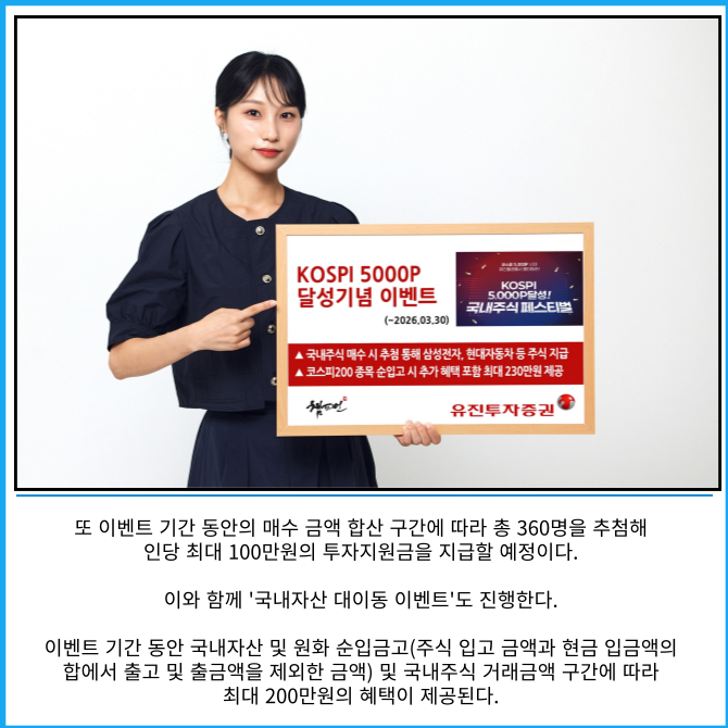 [프라임경제] 유진투자증권은 코스피 5,000 달성을 기념해 국내주식 투자 활성화를 위한 '국내주식 페스티벌'을 진행한다고 2일 밝혔다.