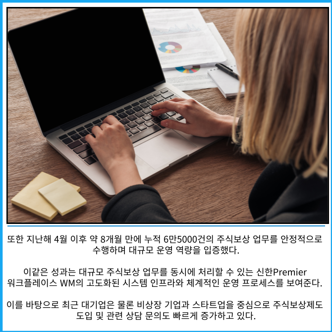 신한Premier 워크플레이스 WM은 기업의 주식보상제도(RSA) 운영과 임직원 자산관리를 연계한 통합 금융 솔루션으로, 지난해 6월 출시 이후 대기업을 중심으로 빠르게 도입이 확산되고 있다.