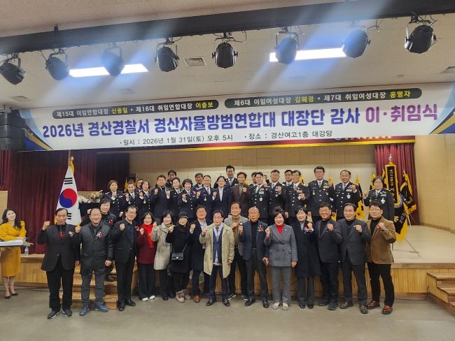경산시자율방범연합대(연합대장 이충보)는 지난 31일 경산여고 1층 대강당에서 '2026년 경산자율방범연합대 대장단 및 감사 이·취임식'을 개최했다.