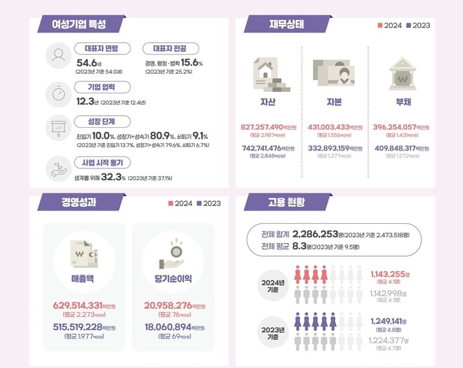 여성기업의 업체당 평균 매출액은 22.7억원을 기록했다. 전년 19.8억원보다 15.0퍼센트 늘어난 수치다. 평균 당기순이익은 0.8억원으로 전년 0.7억원 대비 9.3퍼센트 증가했다. 당기순이익은 기업이 벌어들인 전체 수익에서 모든 비용을 뺀 실제 이익을 말한다.