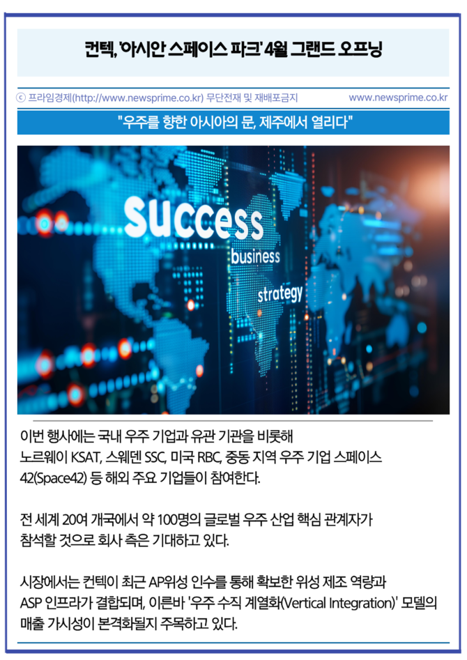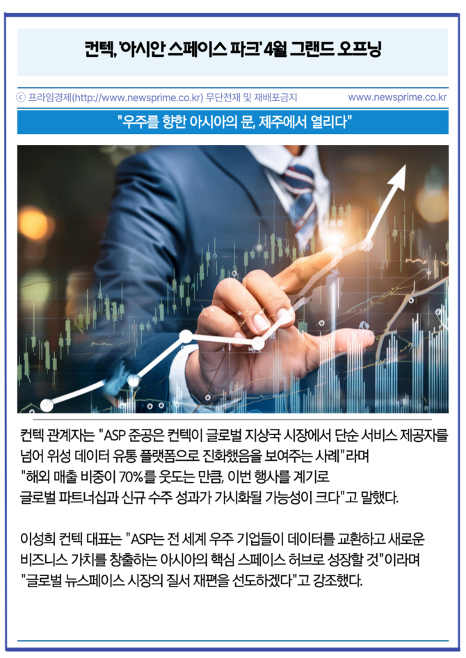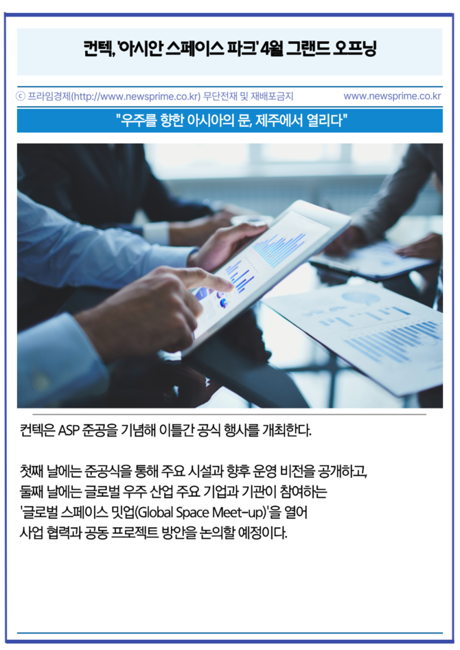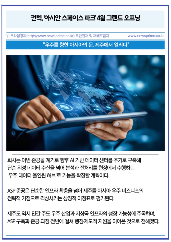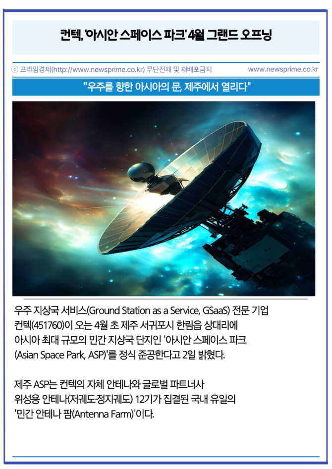 [프라임경제] 우주 지상국 서비스(Ground Station as a Service, GSaaS) 전문 기업 컨텍(451760)이 오는 4월 초 제주 서귀포시 한림읍 상대리에 아시아 최대 규모의 민간 지상국 단지인 '아시안 스페이스 파크(Asian Space Park, ASP)'를 정식 준공한다고 2일 밝혔다.