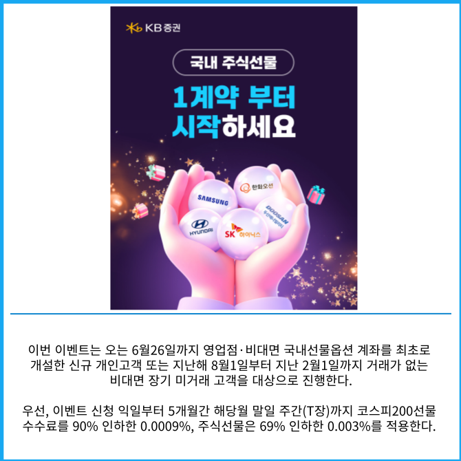 [프라임경제] KB증권은 국내 주식선물 ‘1계약부터 시작하세요’ 이벤트를 진행한다고 3일 밝혔다.