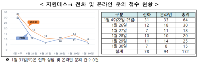 지원데스크의 온라인 접수 건에 대해 접수일로부터 72시간 내(심층 검토 사안은 14일 내) 회신을 하는게 방침이었으나, 법 시행 초기, 기업의 애로사항의 빠른 해소를 위해 첫 개소일부터 10일간은 24시간 이내 답변을 제공했다.