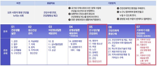 이번 6차 계획(안)은 지난 2021년 마련된 '제5차 종합계획'의 보완책으로서 제5차 계획의 최종 목표인 '건강수명 연장'과 '건강형평성 제고'를 위한 기본 틀은 유지하되 최근 정책 변화와 새 건강 위험 요인을 고려해 총 7개 분과, 31개 중점과제로 구성했다.