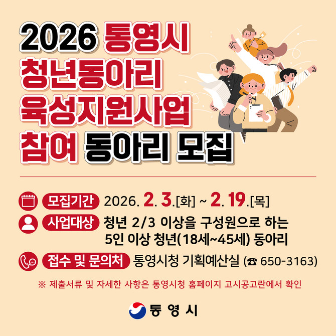 이번 사업은 통영시에 거주하거나 생활권 내 대학 및 사업장에서 활동하는 18세 이상 45세 이하의 청년을 대상으로, 동아리 활동에 필요한 지원금을 제공하는 프로그램이다.