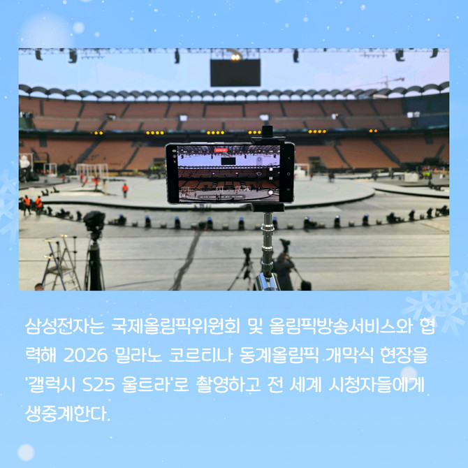 [프라임경제] 삼성전자(005930)는 국제올림픽위원회(IOC), 올림픽방송서비스(OBS)와 협력해 2026 밀라노 코르티나 동계올림픽 개막식 현장을 '갤럭시 S25 울트라'로 촬영하고 전 세계 시청자들에게 생중계한다고 4일 밝혔다.
