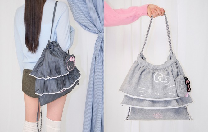 이번 컬렉션에서 프릴백은 편안한 저지 소재와 포멀한 스트라이프 패턴 원단으로 각각 재해석됐다. 저지 소재 프릴백에는 빅 사이즈 헬로키티 자수를 적용해 캐주얼한 매력을 강조했다. 광택감이 돋보이는 스트라이프 패턴 제품에는 프릴 끝단에 레이스 디테일을 더하고, 헬로키티 얼굴 모양 참 장식을 적용해 대비되는 분위기를 완성했다.