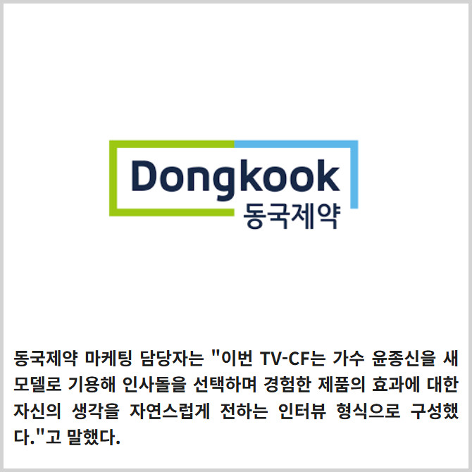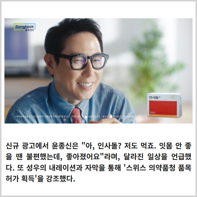 [프라임경제] 동국제약(086450)이 가수 윤종신을 새 모델로 기용한 잇몸약 '인사돌'의 신규 TV-CF를 온에어했다.