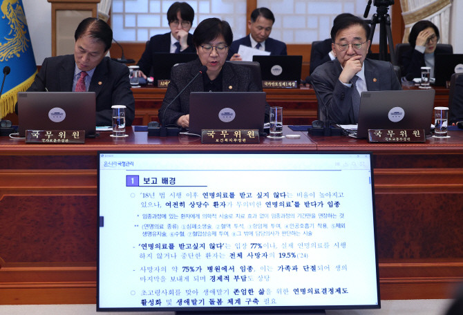 정은경 보건복지부 장관은 업무보고에서 "연명의료를 하지 않겠다고 결정한 환자 역시 마지막 순간까지 적절한 말기 돌봄을 받을 권리가 있다"며 "하지만 현재는 이를 충분히 뒷받침할 기관과 인프라가 부족한 상황"이라고 설명했다.