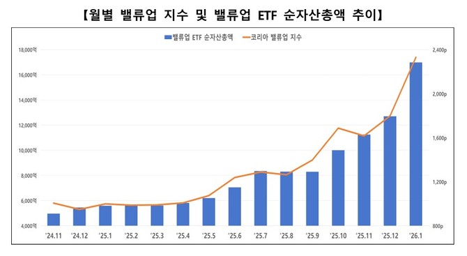 밸류업 관련 투자상품의 성장세도 두드러졌다. 밸류업 ETF 13종목의 순자산총액은 1월 말 기준 1조7000억원으로, 지난 2024년 11월4일 최초 설정 당시보다 255.3% 증가했다.