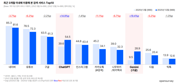 오픈서베이는 "최근 주 이용률 전체 기준으로 챗GPT와 제미나이는 남녀, 전 연령대에서 유의미한 상승을 기록해 검색 저변을 넓혔으나 네이버와 카카오톡(#검색)은 전반적으로 하락해 대조를 이룬다"고 설명했다.