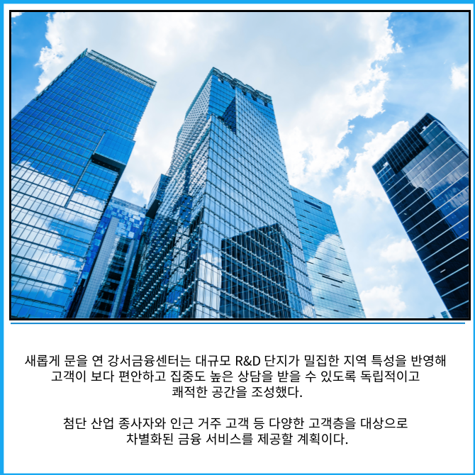 강서금융센터는 마곡지구의 입지적 이점을 최대한 활용하고자 발산역 인근 '강서구 마곡동로 56 건와빌딩 11층'에 위치했다.