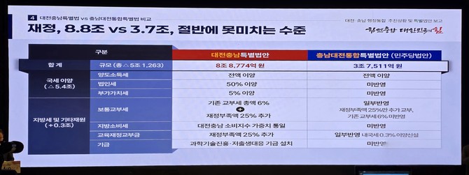 김 지사는 충남·대전 통합안에 담긴 국세 이양 규모를 구체적으로 언급하며 민주당안과의 차이를 분명히 했다. 그는 "우리는 양도소득세 100%, 법인세 50%, 부가가치세 일부 이양 등을 통해 연간 약 9조원 규모의 국세 이양을 요구하고 있다"며 "반면 민주당안은 양도소득세 100% 이양에 그쳐 약 3조7000억원 수준에 불과하다"고 밝혔다.