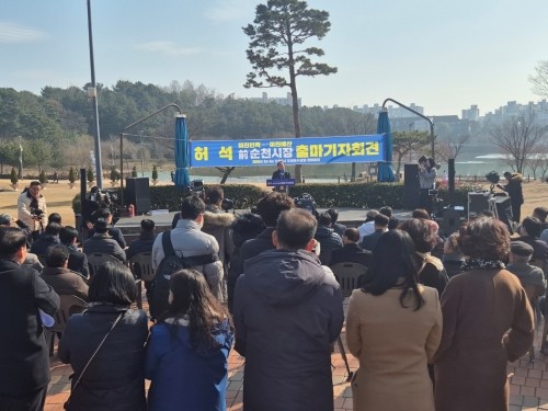 허 전 시장은 조례호수공원 원형광장에서 500여 명의 지지자들이 참석한 가운데 기자회견을 열고 "침체에 빠진 순천경제에 다시 활력을 불어넣고, 시민이 주인 되는 순천을 만들겠다”며 재선 도전의 출사표를 던졌다.
