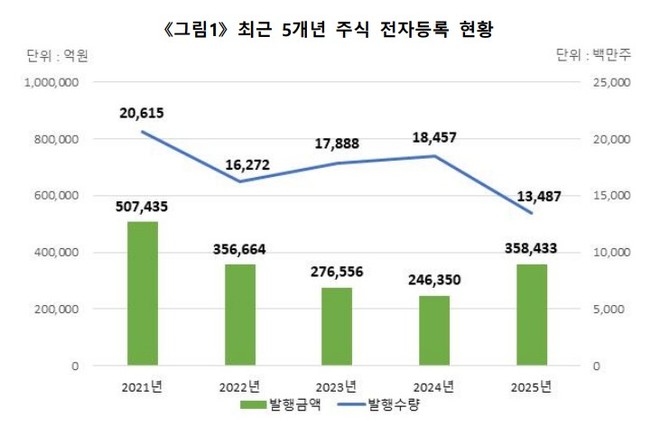 [프라임경제] 지난해 주식 전자등록 발행금액이 35조8000억원을 넘어서며 전년 대비 큰 폭으로 증가한 것으로 나타났다. 발행회사 수와 발행수량은 감소했지만, 유상증자를 중심으로 실제 자금 조달 규모는 확대됐다.