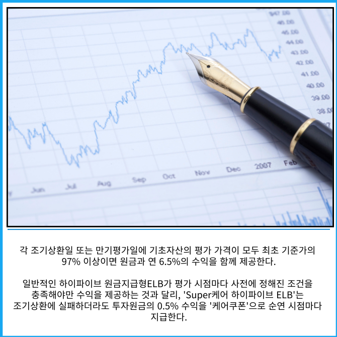 이번에 공모하는 'Super케어 하이파이브 ELB'는 삼성전자와 현대차 보통주를 기초자산으로하는 온라인 전용 3년 만기 원금지급형 상품이다. 최초 청약 이후 6개월마다 조기상환 여부를 평가한다.