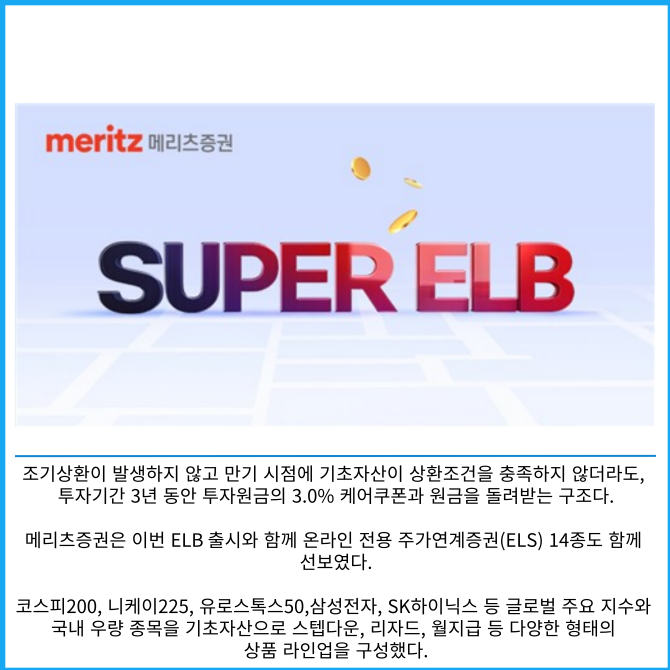 [프라임경제] 메리츠증권은 조기상환에 실패하더라도 순연 시점마다 '케어쿠폰'을 제공하는 주가연계파생결합사채(ELB)를 출시한다고 5일 밝혔다.