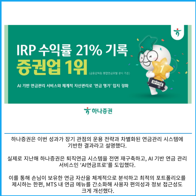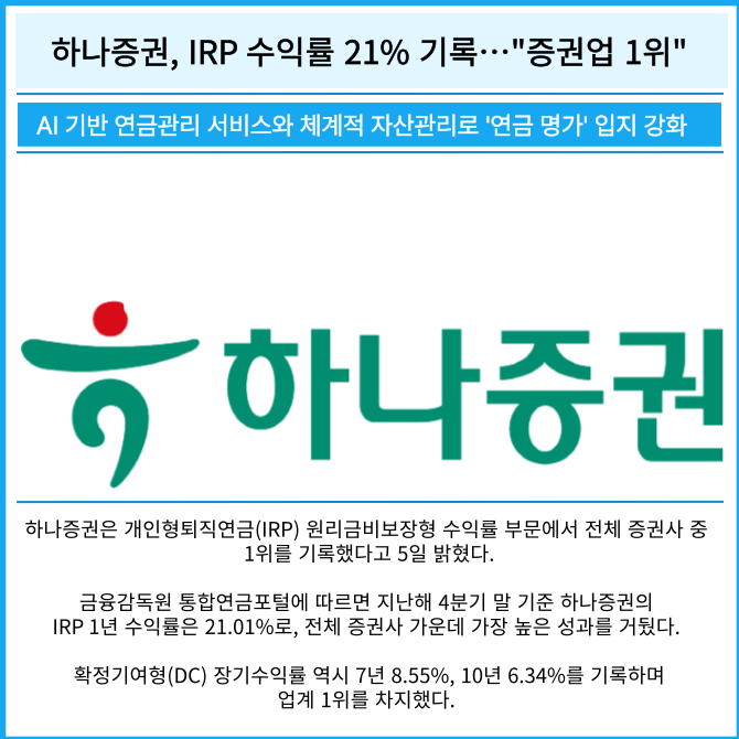 금융감독원 통합연금포털에 따르면 지난해 4분기 말 기준 하나증권의 IRP 1년 수익률은 21.01%로, 전체 증권사 가운데 가장 높은 성과를 거뒀다. 확정기여형(DC) 장기수익률 역시 7년 8.55%, 10년 6.34%를 기록하며 업계 1위를 차지했다.