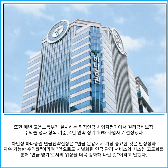 [카드] 하나증권, IRP 수익률 21% 기록…"증권업 1위"