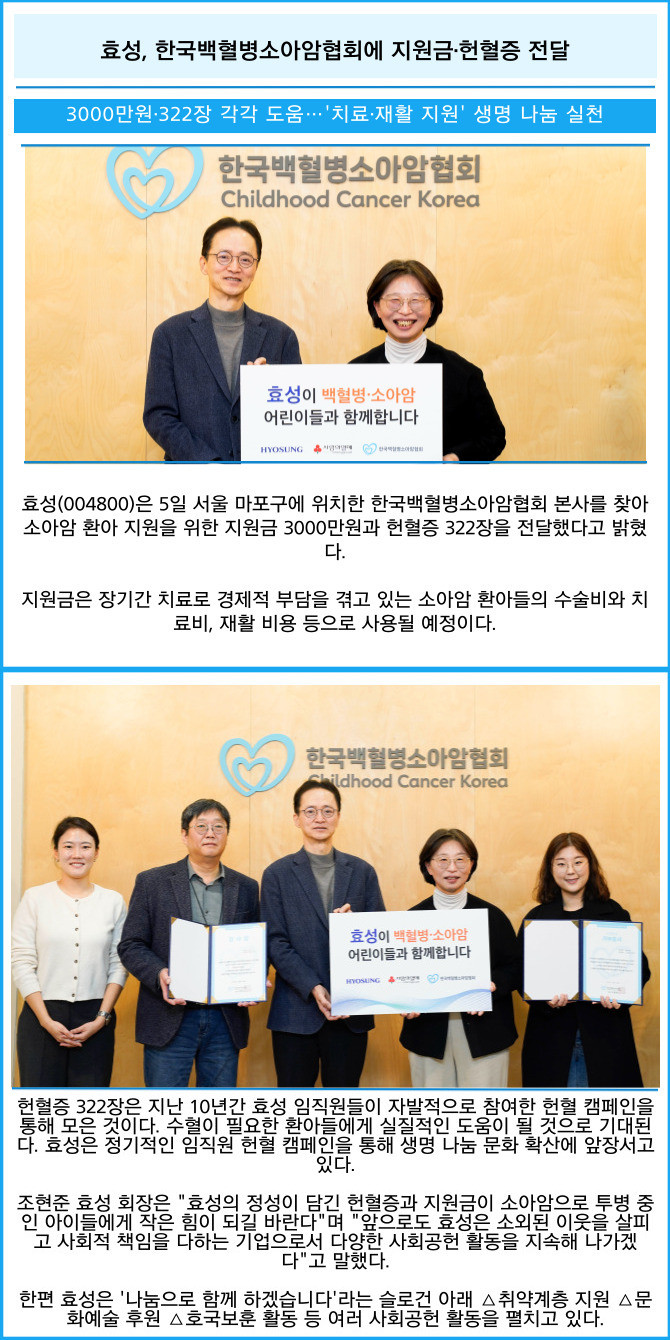 [프라임경제] 효성(004800)은 5일 서울 마포구에 위치한 한국백혈병소아암협회 본사를 찾아 소아암 환아 지원을 위한 지원금 3000만원과 헌혈증 322장을 전달했다고 밝혔다.