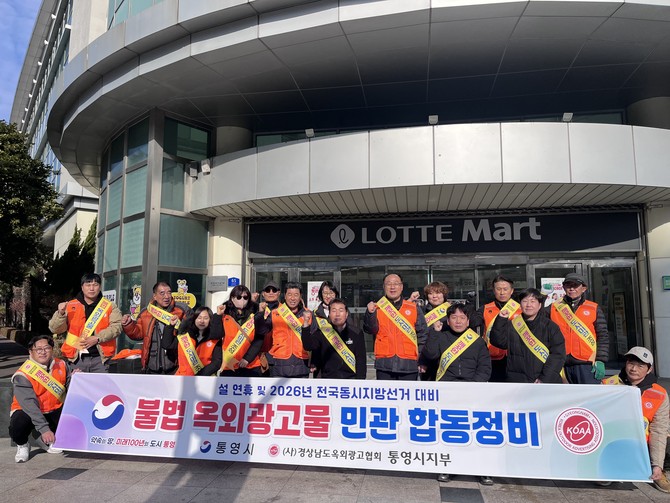 통영시는 설 연휴를 맞아 고향을 찾는 귀성객과 관광객들에게 쾌적하고 안전한 거리 환경을 제공하기 위해 지난 4일 경남도 옥외광고협회 통영시지부와 함께 불법 옥외광고물 일제 정비 활동과 근절 캠페인을 실시했다고 5일 밝혔다.