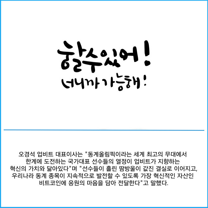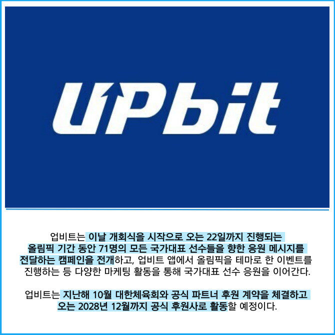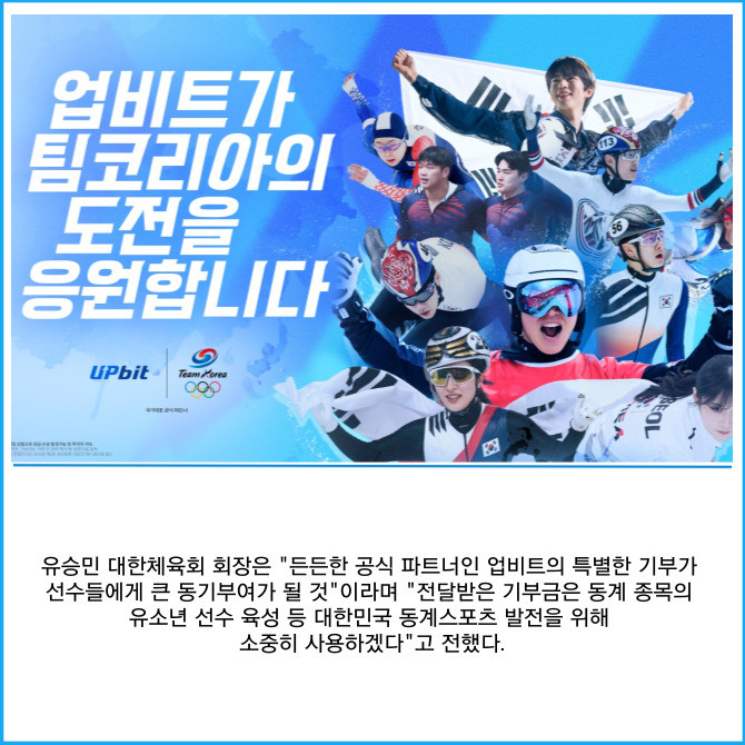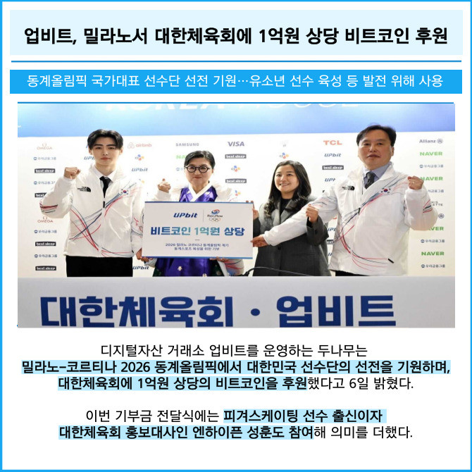 [프라임경제] 디지털자산 거래소 업비트를 운영하는 두나무는 밀라노-코르티나 2026 동계올림픽에서 대한민국 선수단의 선전을 기원하며, 대한체육회에 1억원 상당의 비트코인을 후원했다고 6일 밝혔다.