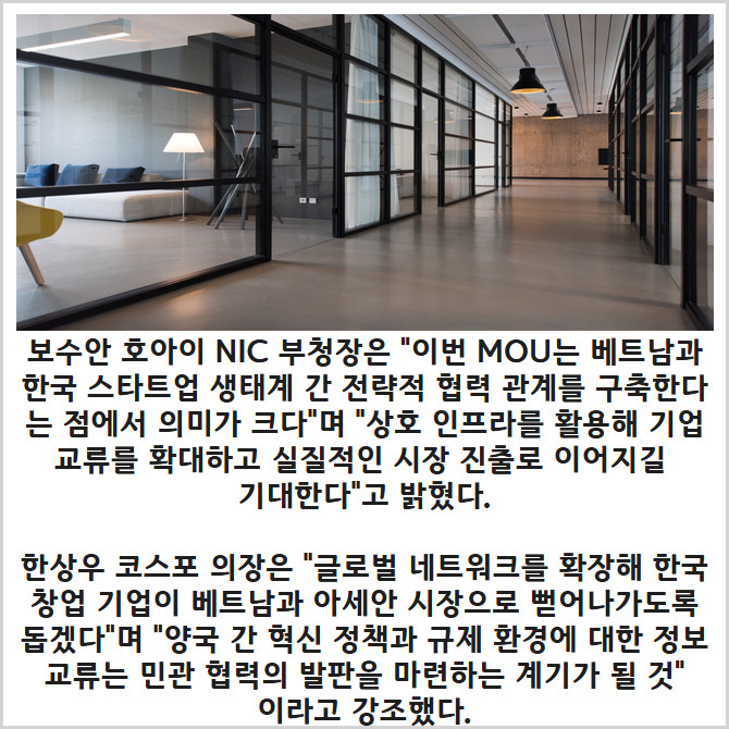 [프라임경제] 코리아스타트업포럼(의장 한상우, 이하 코스포)은 베트남 국가혁신청(NIC)과 스타트업 생태계 발전 및 창업 네트워크 교류 활성화를 위한 업무협약을 체결했다고 6일 밝혔다.