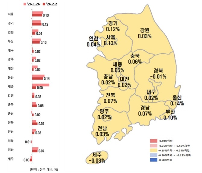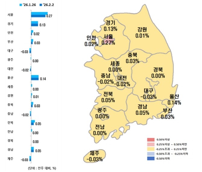 한국부동산원이 발표한 '2026년 2월 첫째 주 주간 아파트 가격 동향'에 따르면 전국 아파트 매매가는 전주대비 0.09% 상승, 전세가의 경우 0.08% 올랐다. 매매와 전세가 함께 상승했다는 점에서 수요가 한쪽으로 쏠리기보단 주거 '이동 수요 및 임차 수요가 동시에 작동했다'라는 게 업계 분석이다.