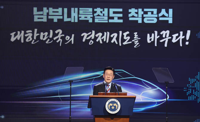 어어 이 대통령은 "주민들은 타지를 가려면 오랜 시간 차를 타야 했고, 청년들은 일자리를 찾아 먼 도시로 떠나야 했다. 동네에서 기차역 하나 없는 설움이 시간이 지나며 지역의 경쟁력을 떨어뜨렸고, 끝내 지역의 소멸 위기까지 불러오고 있다"며 "그래서 남부내륙철도는 단순히 선로 하나를 놓는 사업이 아니다"고 강조했다.