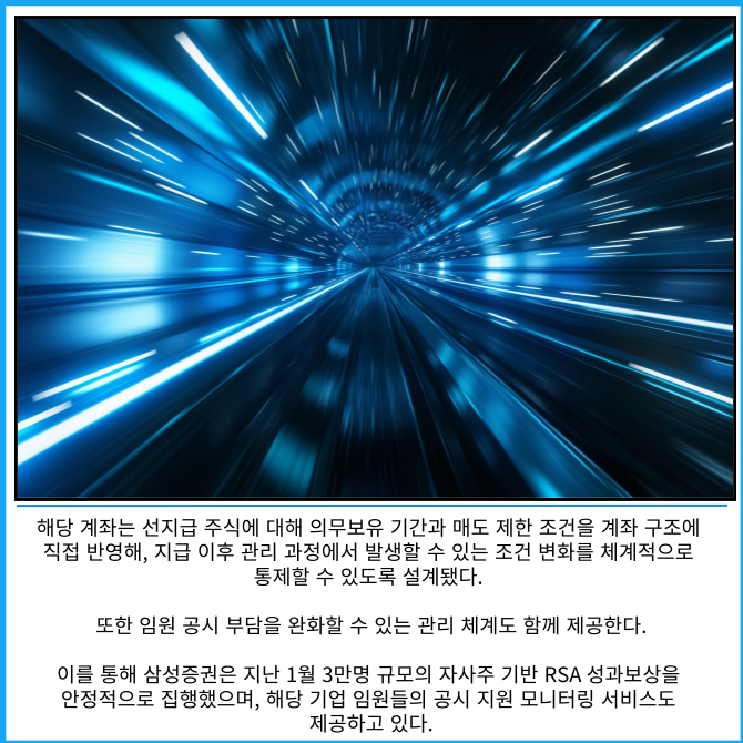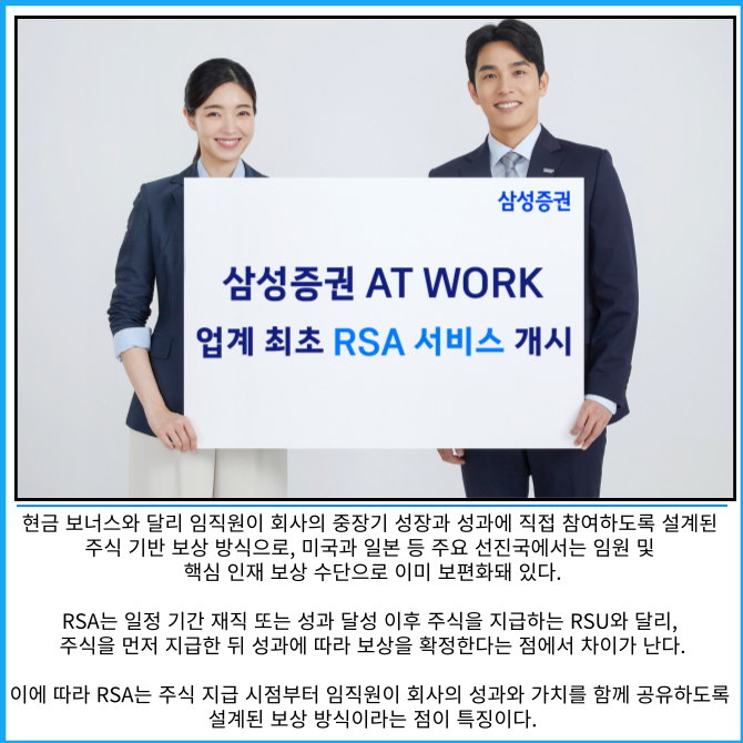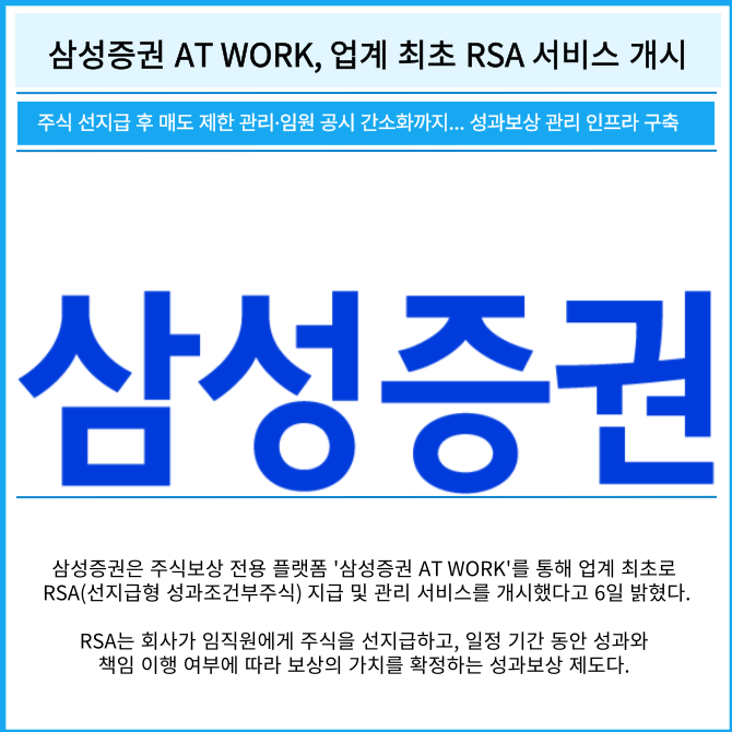 [프라임경제] 삼성증권(016360)은 주식보상 전용 플랫폼 '삼성증권 AT WORK'를 통해 업계 최초로 RSA(선지급형 성과조건부주식) 지급 및 관리 서비스를 개시했다고 6일 밝혔다.