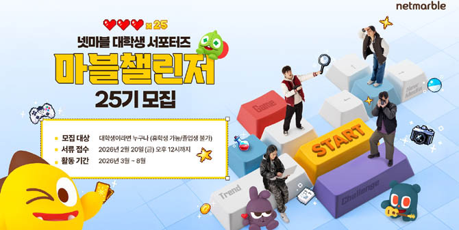 넷마블(251270, 대표 김병규)은 대학생 대외활동 프로그램 '마블챌린저' 25기를 모집한다. 지원 희망자는 2월 20일까지 넷마블 공식 채용 홈페이지를 통해 서류를 접수하면 된다. 서류 및 면접을 거쳐 최종 선발된 '마블챌린저' 25기는 올해 3월부터 8월까지 약 6개월 간 다양한 활동을 수행하게 된다. 구체적으로 △유튜브 및 인스타그램 등 뉴미디어 홍보 콘텐츠 기획 및 제작 △마블챌린저 공식 블로그 포스팅 작성 △게임 업계 트렌드 리포트 분석 △넷마블 온오프라인 행사 기획 및 실행 등 현업 실무를 체험할 수 있다. '마블챌린저'에게는 활동 혜택으로 수료증과 함께 매월 소정의 활동비가 지급된다. 아울러 활동 수료 시 넷마블 입사 지원 과정에서 서류 전형 우대 혜택을 제공하며, 실무자들의 밀착 멘토링을 통해 게임 산업에 대한 깊이 있는 경험을 쌓을 수 있다.