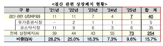 특히 지난해 기준 전체 상장폐지 기업 대비 결산 관련 상장폐지 비중은 9.6%로 전년(7.3%)보다 확대됐다. 결산 리스크가 구조적인 퇴출 요인으로 작용하고 있다는 평가가 나온다.