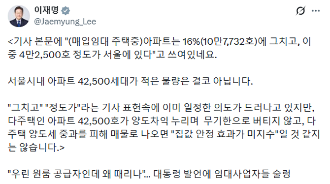 이 대통령은 이날 자신의 X(구 트위터)에 '우린 원룸 공급자인데 왜 때리나…대통령 발언에 임대사업자들 술렁'이라는 제목의 기사를 공유하고 "기사 본문에 '(매입임대 주택중)아파트는 16%(10만7732호)에 그치고, 이중 4만2500호 정도가 서울에 있다'고 쓰여 있다"며 이같이 말했다.