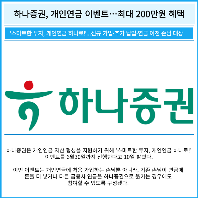 [프라임경제] 하나증권은 개인연금 자산 형성을 지원하기 위해 '스마트한 투자, 개인연금 하나로!' 이벤트를 6월30일까지 진행한다고 10일 밝혔다.