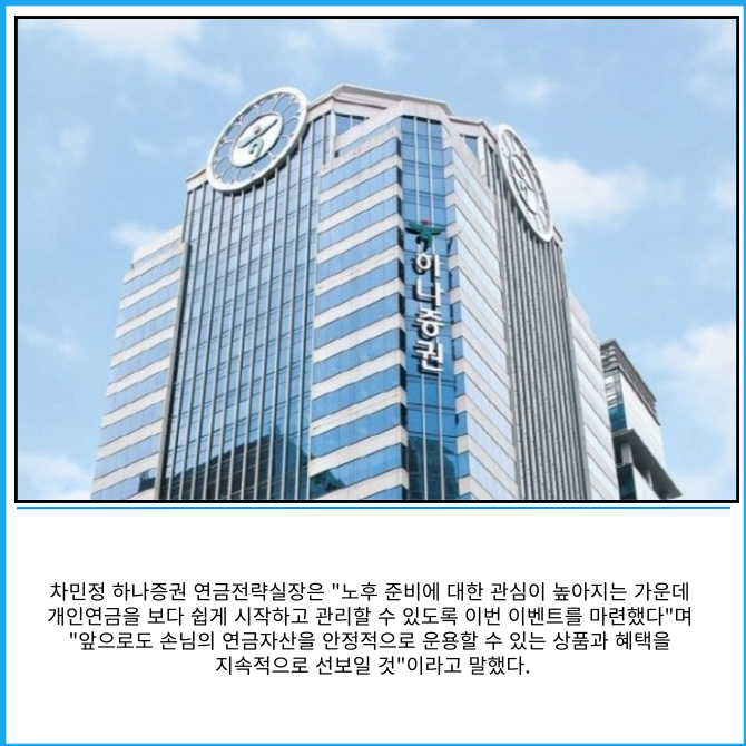 이번 이벤트는 개인연금에 처음 가입하는 손님뿐 아니라, 기존 손님이 연금에 돈을 더 넣거나 다른 금융사 연금을 하나증권으로 옮기는 경우에도 참여할 수 있도록 구성됐다.