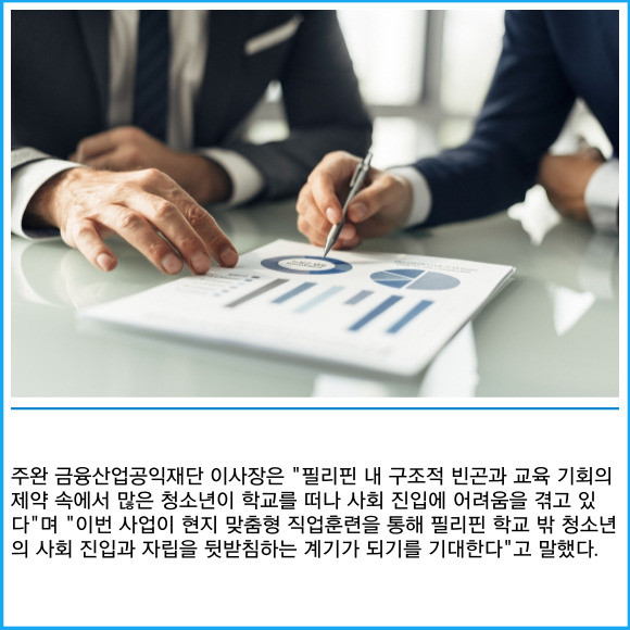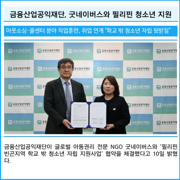 [프라임경제] 금융산업공익재단이 글로벌 아동권리 전문 NGO 굿네이버스와 '필리핀 빈곤지역 학교 밖 청소년 자립 지원사업' 협약을 체결했다고 10일 밝혔다.
