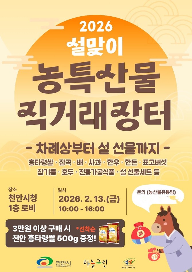 설맞이 직거래장터는 참여 규모와 품목 구성을 지난해보다 대폭 확대했다. 아우내농협 등 22개 생산자·단체가 참여해 배와 흥타령쌀, 한우 등 37개 품목의 제수용품과 설 선물용 농특산물을 저렴한 가격에 판매할 예정이다.