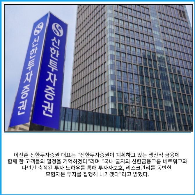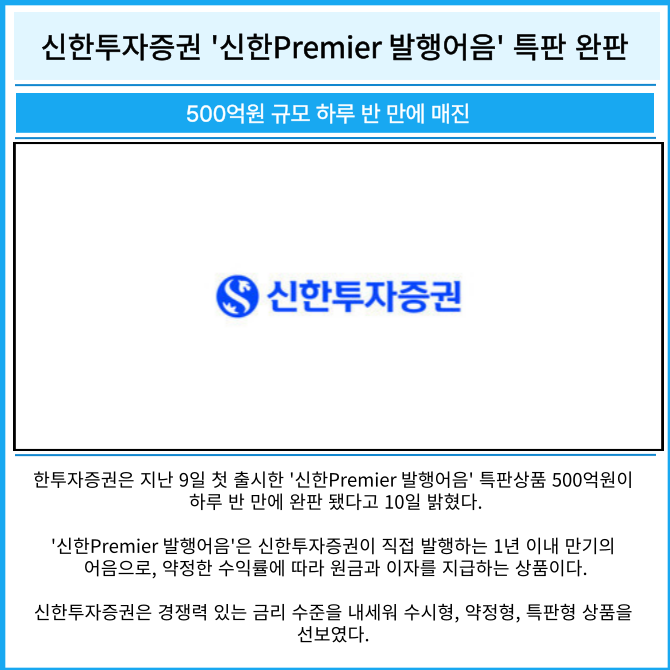 [프라임경제] 신한투자증권은 지난 9일 첫 출시한 '신한Premier 발행어음' 특판상품 500억원이 하루 반 만에 완판 됐다고 10일 밝혔다.