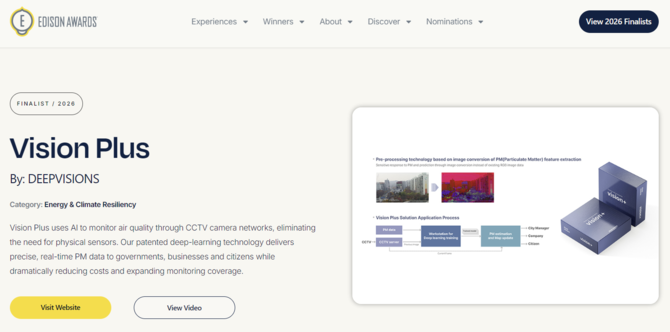 [프라임경제] 딥비전스(대표 강봉수)는 '에디슨 어워즈 2026'에서 파이널리스트로 공식 선정됐다고 10일 밝혔다. '에너지 및 기후 회복 탄력성(Energy & Climate Resiliency)' 부문에서 전 세계 단 3개 업체 중 하나로 이름을 올려 기술력을 입증했다.